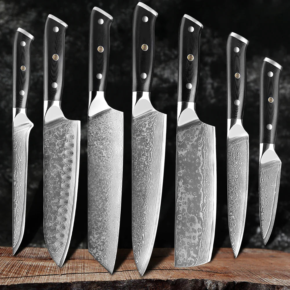 Nossas facas Damasco apresentam lâminas super afiadas, forjadas à mão a partir de aço Damasco japonês de 67 camadas VG10 com uma dureza de 62±1 HRC. Experimente a nitidez extrema de longa duração que torna cada corte uma brisa.