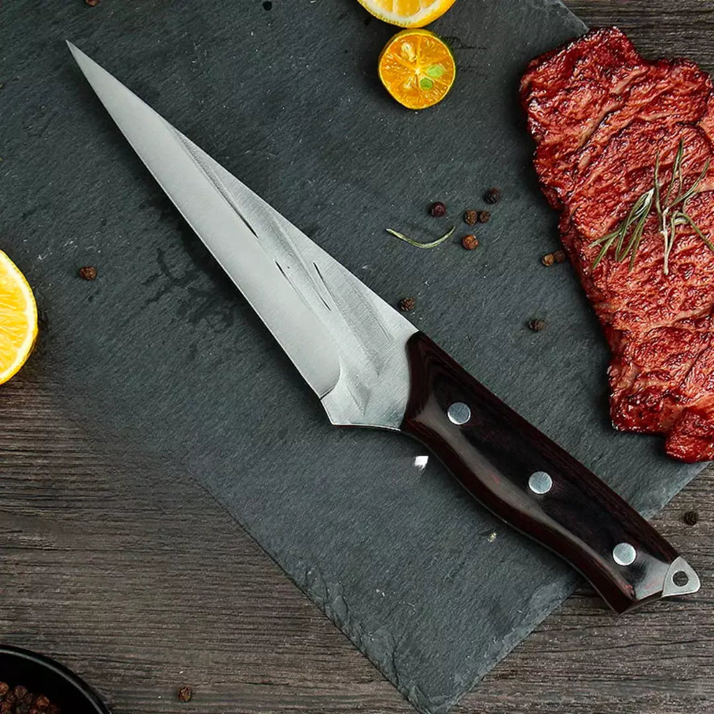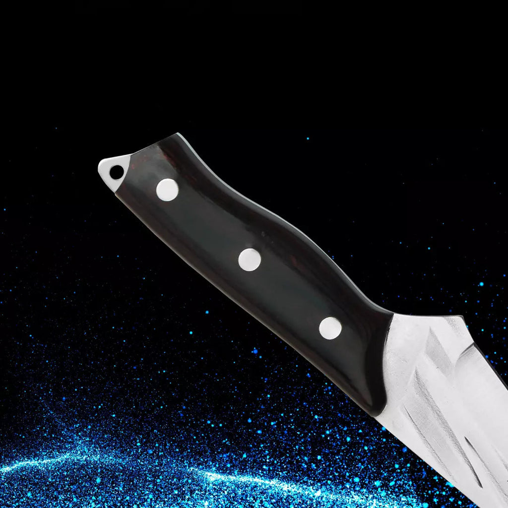Sua lâmina é forjada à mão na mais alta qualidade da cutelaria. Seu material confere um alto grau de força, tração, dureza e resistência ao desgaste. Possui um poder de corte muito superior, podendo manter seu fio de corte afiado por até 5x mais tempo que outras facas.